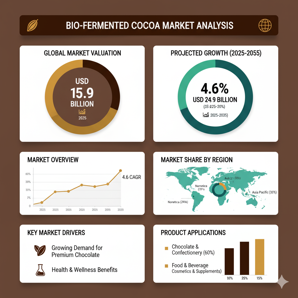ROCKVILLE, MD, UNITED STATES, October 14, 2025 /EINPresswire.com/ -- The global Bio-Fermented Cocoa market is projected to reach USD 24.9 billion by 2035, rising from an estimated USD 15.9 billion in 2025. Over the forecast period from 2025 to 2035, the market is expected to grow at a CAGR of 4.6%.